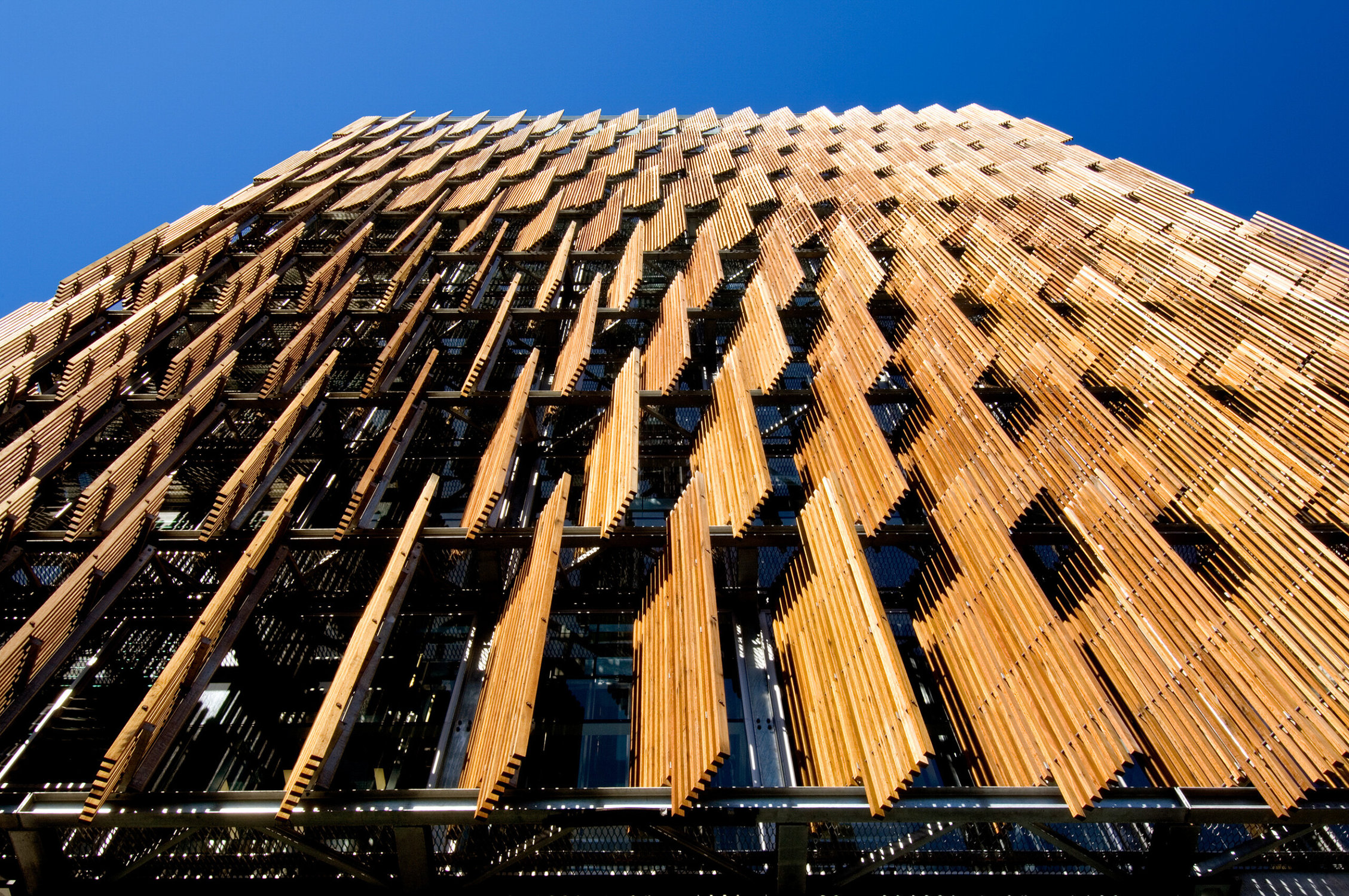 Installation of the statement recycled timber facade required a purpose designed and certified lifting frame and installation platform that reduced anticipated timing by 25 percent, while eliminating working at heights risks. The unique, 10 tonne curved precast concrete ceiling panels were transported with the help of built for purpose, high density foam blocks – a silhouette of the panel profile. The focus of sustainability extended beyond the built outcome – encompassing the construction procress itself, with more than 85 percent of site waste recycled.