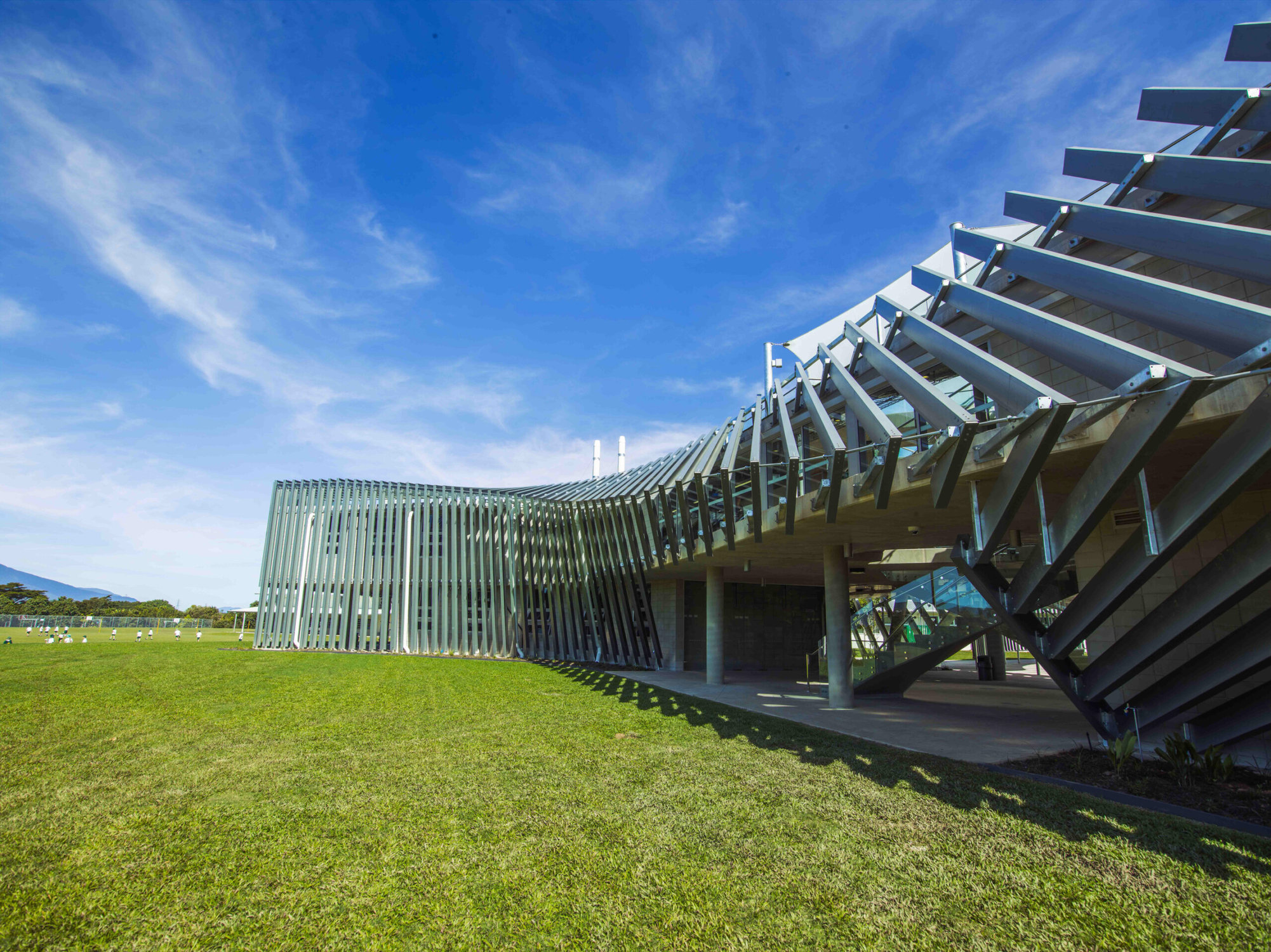 Hansen Yuncken partnered with Charles Wright Architects to deliver the flagship science building at Trinity Anglican School, a two storey structure of concrete and single masonry block construction wrapped in an articulated sunscreen of prefabricated steel channels. The ground floor comprises two learning areas, a teachers’ room, reception and an airconditioning plant room. The first floor comprises two physics laboratories, two biology laboratories, two chemistry laboratories, associated stores and a teachers’ office. The interiors of these spaces are sparsely utilitarian, with services expressed against off form concrete ceilings. The roof is covered in synthetic grass, providing events and solar equipment areas and accessed by the central stairs and lift.